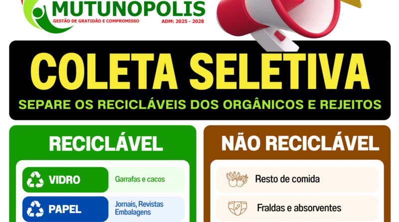 A Prefeitura de Mutunópolis, por meio da Secretaria de Meio Ambiente, intensificou a campanha de conscientização sobre a coleta seletiva, convidando toda a comunidade a adotar o hábito de separar o lixo. O foco é reduzir o descarte incorreto de resíduos, preservar o meio ambiente e promover práticas sustentáveis que beneficiem a cidade como um todo.